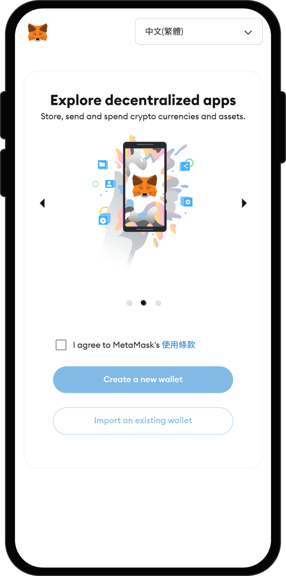 下載並設定相容的加密貨幣錢包。熱門選項包括MetaMask(以太坊、BSC)和Phantom(Solana)。